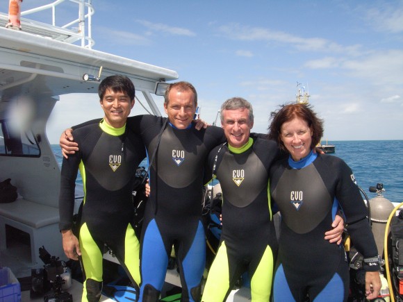 NEEMO 15 crew members from right to left: Shannon Walker (NASA), Steve Squyres (Cornell University), David Saint-Jacques (Canadian Space Agency), Takuya Onishi (Japanese Space Agency).