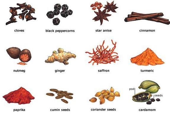 В Индии мы повсеместно встретим curry (карри). Еще одна восточная пряность — это мускат. Он может быть двух видов: mace (мускатный цвет) и nutmeg (мускатный орех). Не забудем и про saffron (шафран) и turmeric (куркума).