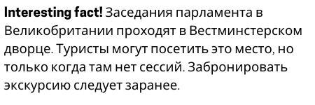 Interesting fact! В Великобритании нет писаной конституции. Конституционная монархия означает, что монарх имеет высшую власть над правительством. По факту монарх обычно следует законам парламента или соблюдает британские традиции. Монарх также назначает премьер-министра, лидера правительства. Королева Елизавета II является монархом с 1952 года.