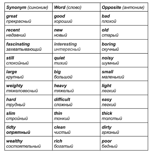 Описание на английском: синонимы и антонимы прилагательных
