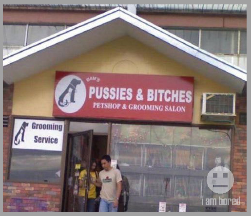 А вот это всего лишь зоомагазин и салон для наведения красоты для собачек и кошечек. Мы надеемся, что владельцы с помощью такого названия хотели всего лишь пошутить. Ведь “pussy” означает не только кошечка, а слово “bitch” намного чаще используется в значении «нехорошая, недобрая женщина».