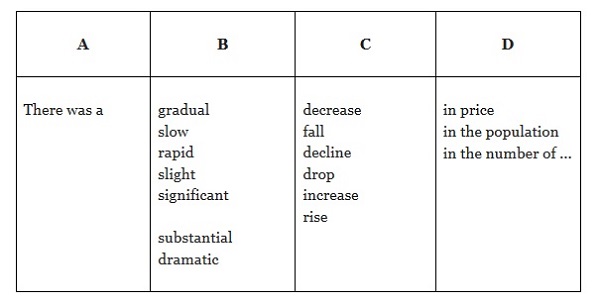 На этом рисунке уже не три, а четыре колонки, где мы добавляем вводную фразу “There was a…”, чтобы добиться обратного порядка слов. Дальше, в колонке B у нас идёт прилагательное, характеризующее характер изменений, в C - существительное, указывающее на тип изменений (увеличение чего-либо, возрастание чего-либо, снижение, спад и так далее), а дальше, в D, то, с чем произошли изменения - цена, число или количество чего-либо и популяция.