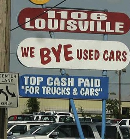 Следующему бизнесу тоже не очень повезло. Судя по знакам, это фото было сделано в США. Тут автор попался в ловушку слов “bye” и “buy”. Рекламная надпись должна была привлекать клиентов, показывая, что тут “покупают подержанные машины” (“We buy used cars”). Однако допущенная ошибка полностью изменила смысл рекламы.