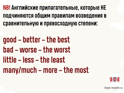 Несмотря на то, что род и падежи не влияют на форму английских прилагательных, они все же будут видоизменены в сравнительной и превосходной степенях.