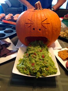 На самом деле в голове этого блюда нет ничего сложного. Надо постепенно перемешать отдельно ингредиенты для гуакамоле, и отдельно составляющие соуса queso. Единственное, соус quesco надо варить на плите. Ну а потом все соуса аккуратно засунуть их в нашу тыкву.