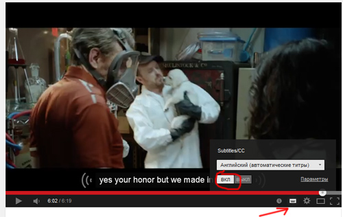 Включаются они следующим образом: в нижнем правом углу нужно нажать на прямоугольную иконку (иногда на ней написано "сс").