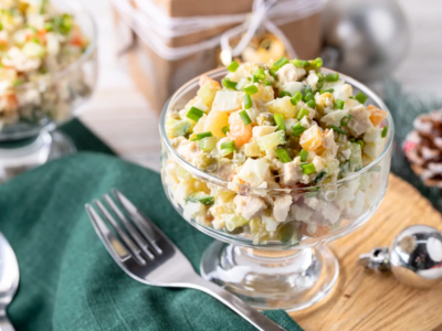Салат Оливье, также известный как “русский салат”, есть почти в каждом ресторане в Соединенных Штатах. Интересно, но, несмотря на непопулярность салатов с майонезом в Америке, именно “Оливье” стал фаворитом русской кухни, обогнав даже винегрет.