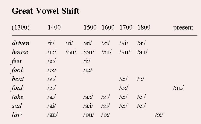 Принципиальные изменения в фонетике произошли позже. Великий Сдвиг Гласных (Great Vowel Shift) разделил английский язык на два.