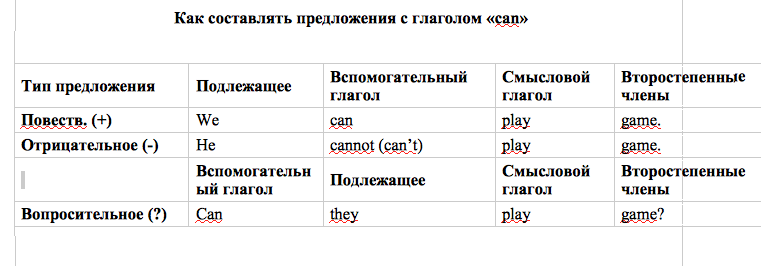 Can – это модальный глагол, который на русский чаще всего переводится глаголом «мочь», уметь.