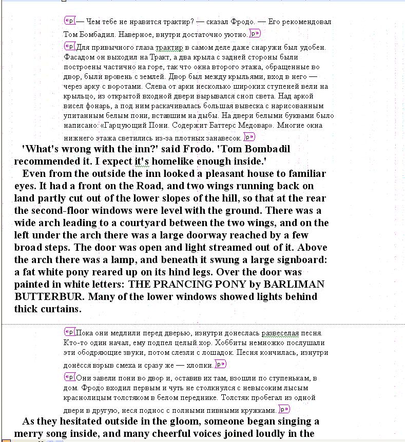 Если есть желающие прочитать "Властелин колец" в оригинале, но знание английского не дотягивает, я тут соединяю текст оригинала с русским, относительно дословным переводом (с сохранением количества предложений и без отсебятины), В.А. Маториной. чередую куски размером примерно одного-двух абзацев, так чтобы на электронной книге (или с экрана) всё это можно было читать в виде - сначала русский перевод потом этот же кусок в оригинале и так по кругу, не мучаясь с открытием каждый раз то оригинала, то русского перевода. В таком духе сделал и прочёл уже всю первую книгу (читаю первый раз). На мой взгляд вполне полезная вещь чтобы осваивать и английский и книгу параллельно. Впереди ещё 5 книг, если найдутся единомышленники, был бы рад разделить эту работу на двоих.