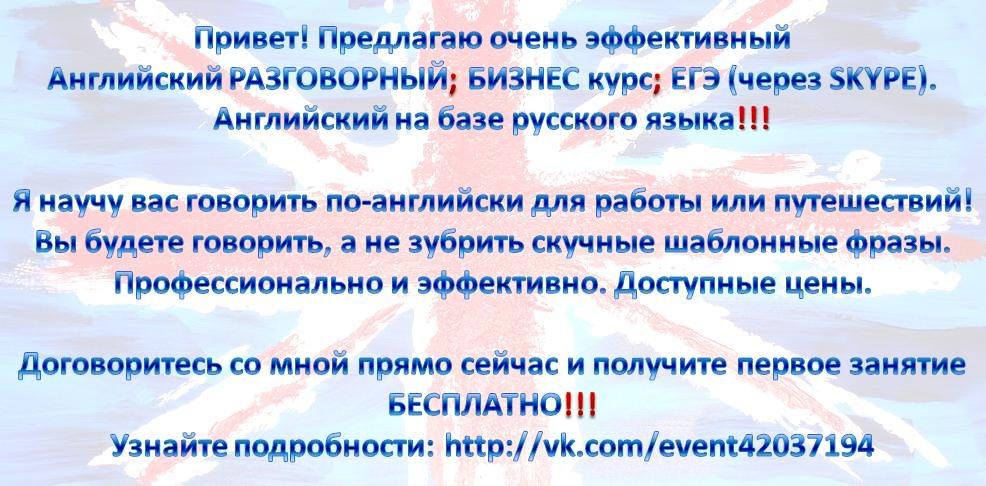 Помогу выучить английский язык по Скайпу. Разрушу языковой барьер. Поставлю британское произношение. Доходчиво объясню грамматику. 315 рублей за 45 минут, но первый урок бесплатно - http://english16.net