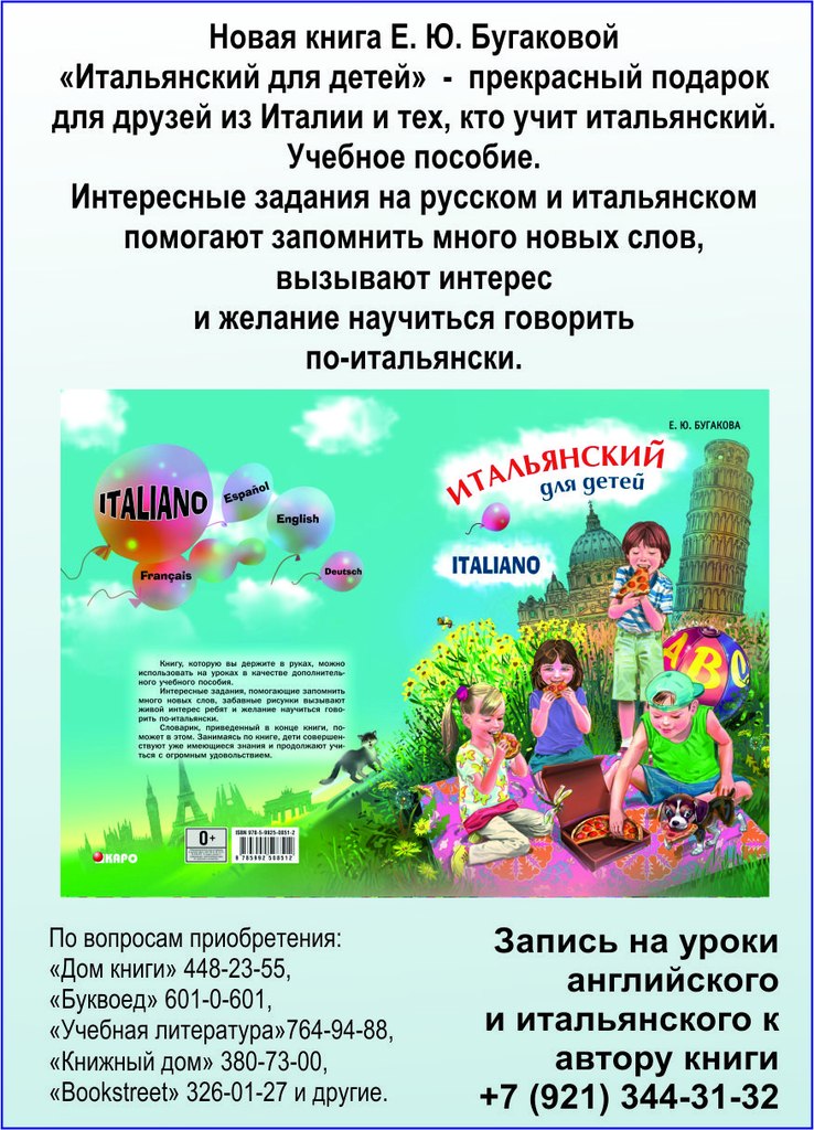 Английский и итальянский для детей и взрослых с опытным преподавателем ( стаж около 20 лет), автором книг на английском и итальянском, изданных в Италии и Росии (в том числе учебник английского на итальянском). БЕСПЛАТНО первый урок английского. Подробности по телефону или в личных сообщениях. Приглашаю!