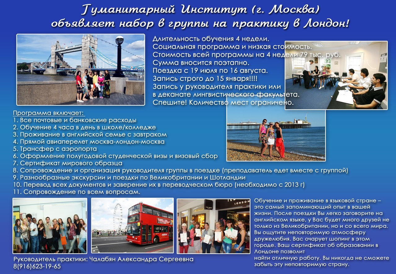 Гуманитарный Институт (г Москва) объявляет набор в группы на практику в Лондон! Длительность обучения 4 недели. Социальная программа и низкая стоимость. Стоимость всей программы на 4 недели 79 тыс. руб. Сумма вносится поэтапно. Поездка с 19 июля по 16 августа 2014. Запись строго до 15 января!!!! Запись у руководителя практики или в деканате лингвистического факультета. Спешите! Количество мест ограниченно.