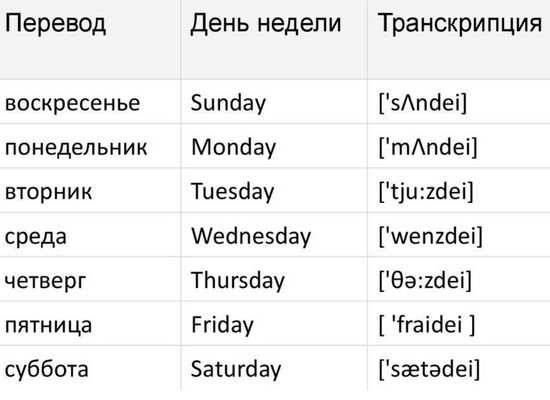 - Воскресенье, понедельник, вторник, среда, четверг, пятница, суббота.