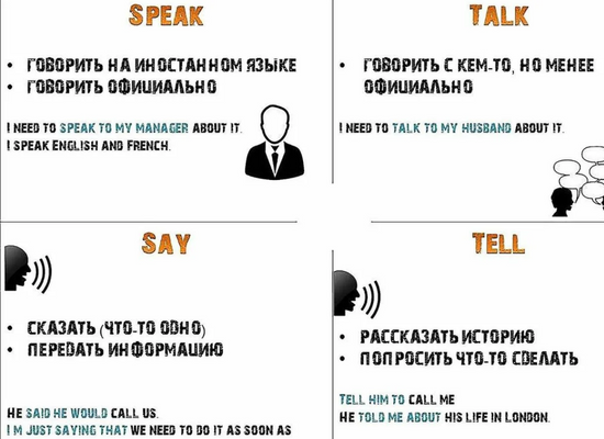 Переходите на эту статью, чтобы узнать, в чем разницу между say, tell и speak в английском.