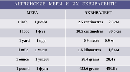 - Стоит запомнить:1 mile = 1,609 км, 1 foot = 30 см, 1 pound = 450 г, 1 pint = 0,56 л, 1 acre = 4046,86 м2.