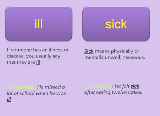 - Illness — болезнь. She's ill — она больна. To же самое значит предложение she's sick. Sick чаще используется в американском варианте английского.