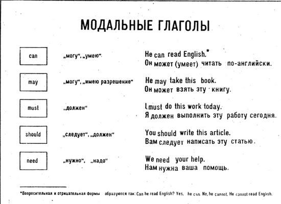Этот глагол имеет много значений в сочетании с местоимениями. Например: to get up — встать, to get in —войти, въехать, to get over — преодолеть, to get into — войти, добраться до, to get on — сесть в, /em> to get off — выйти. - Припомним еще раз глаголы can — мочь, быть в состоянии, may - мочь и must — быть должным, обязанным [должен, обязан], во всех лицах они имеют одну и ту же форму, образуют самостоятельные вопросы: Can you ...?; May I ...?; Must you ...? Только can и may имеют вторую форму, но could чаще встречается в формах вежливых — Could you come?: He мог бы ты прийти?, a might скорее выражает предположение, возможность: I might come: возможно, что приду, нежели выражает действия в прошлом. В прошедших и будущих временах вместо них могут встречаться выражения to be able to (can) и to have to (must) — I was able to come: я мог прийти; I had to come — я должен был прийти.