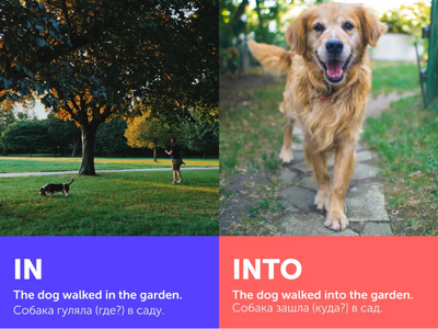 - In, into — в, внутрь. Into —внутрь чего-либо — используется в связке с глаголами движения. He jumped into the water — Он прыгнул в воду. Не got into the car — Он оказался в автомобиле [вошел/проник в автомобиль].