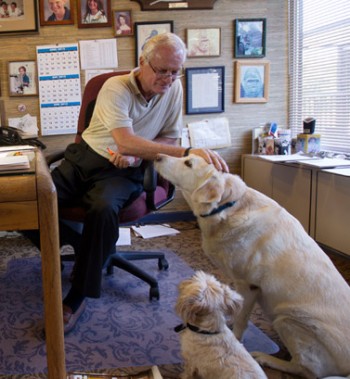 Rosen’s office is as unassuming as he is. His dogs, Bambi and Apple, are frequent officemates.