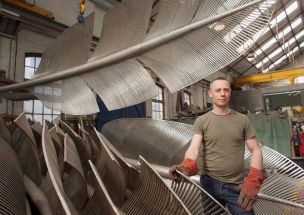 Sculptor Alex Pentek stands next to the massive 20-foot feathers he made for the "Kindred Spirits" monument.