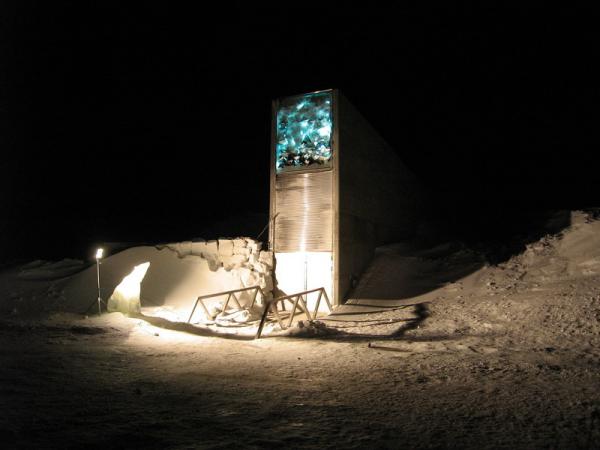The Svalbard Global Seed Vault entrance, lit up by fiberoptics the night after its opening.