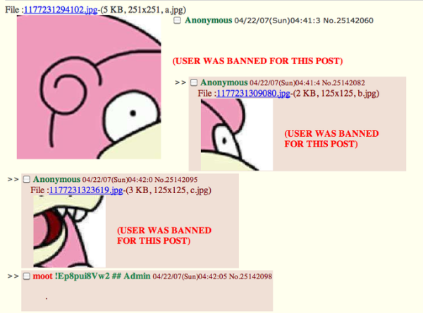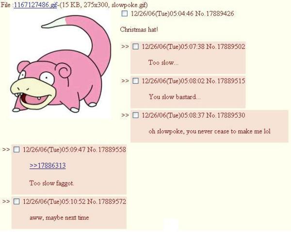 An image of a Slowpoke on a white background was first introduced on 4chan, specifically the /b/ (random) board, as a method of trolling, accompanied by a post that was clearly untimely or no longer relevant in current news. One of the earliest archived posts featuring Slowpoke was captioned “Christmas hat!” and uploaded on December 26th, 2006.