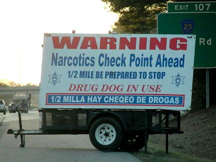 Внимание! На пути следования пост проверки на наркотики. Будьте готовы остановиться. Используем собаку для поиска наркотиков.