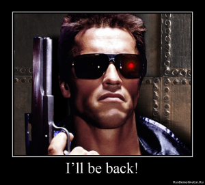 'I’ll be back' («Я вернусь») — фраза киборга из фильма "Терминатор", ставшая мемом. Фраза занимает 37 позицию в списке 100 известных цитат из американских фильмов за 100 лет.